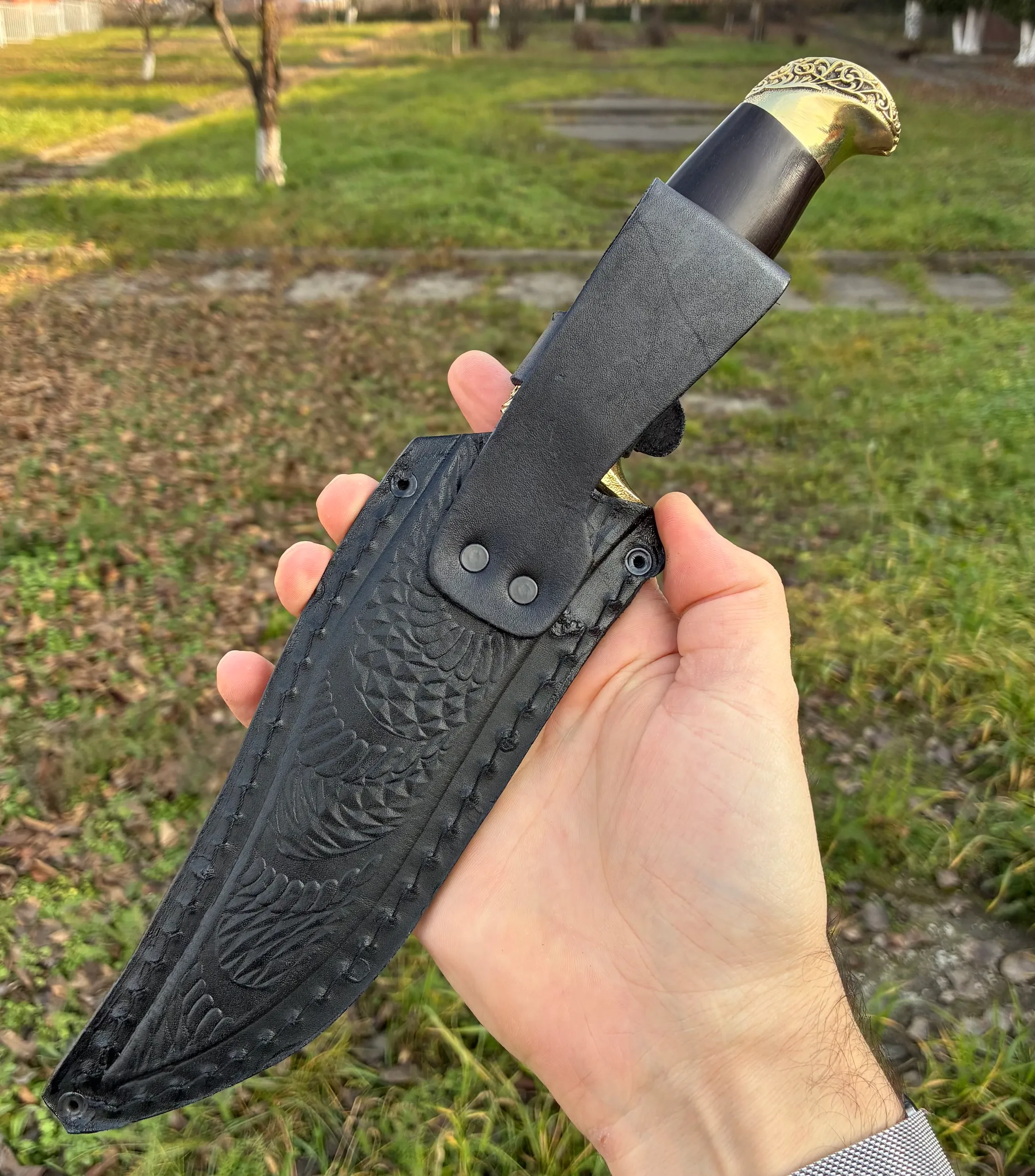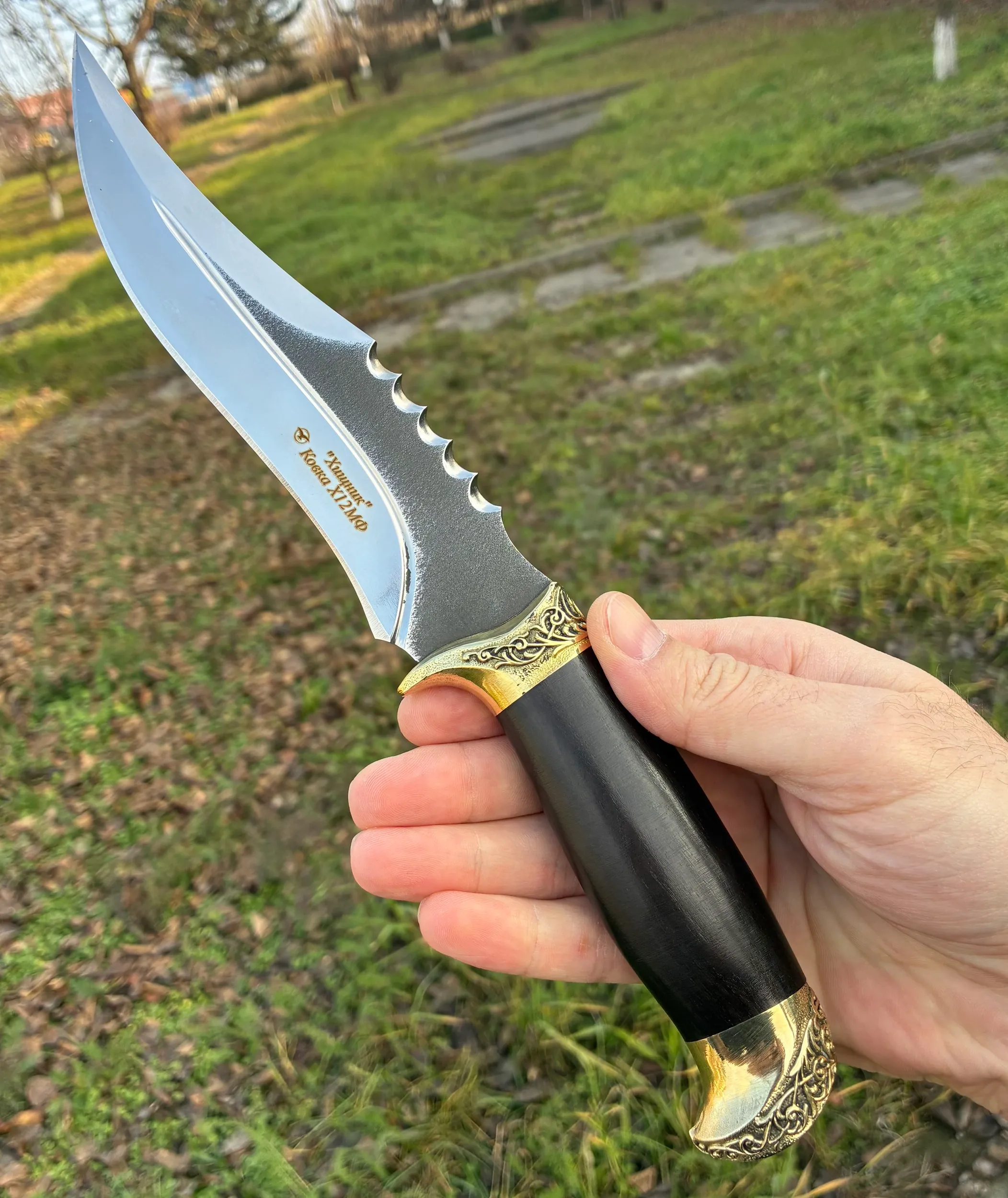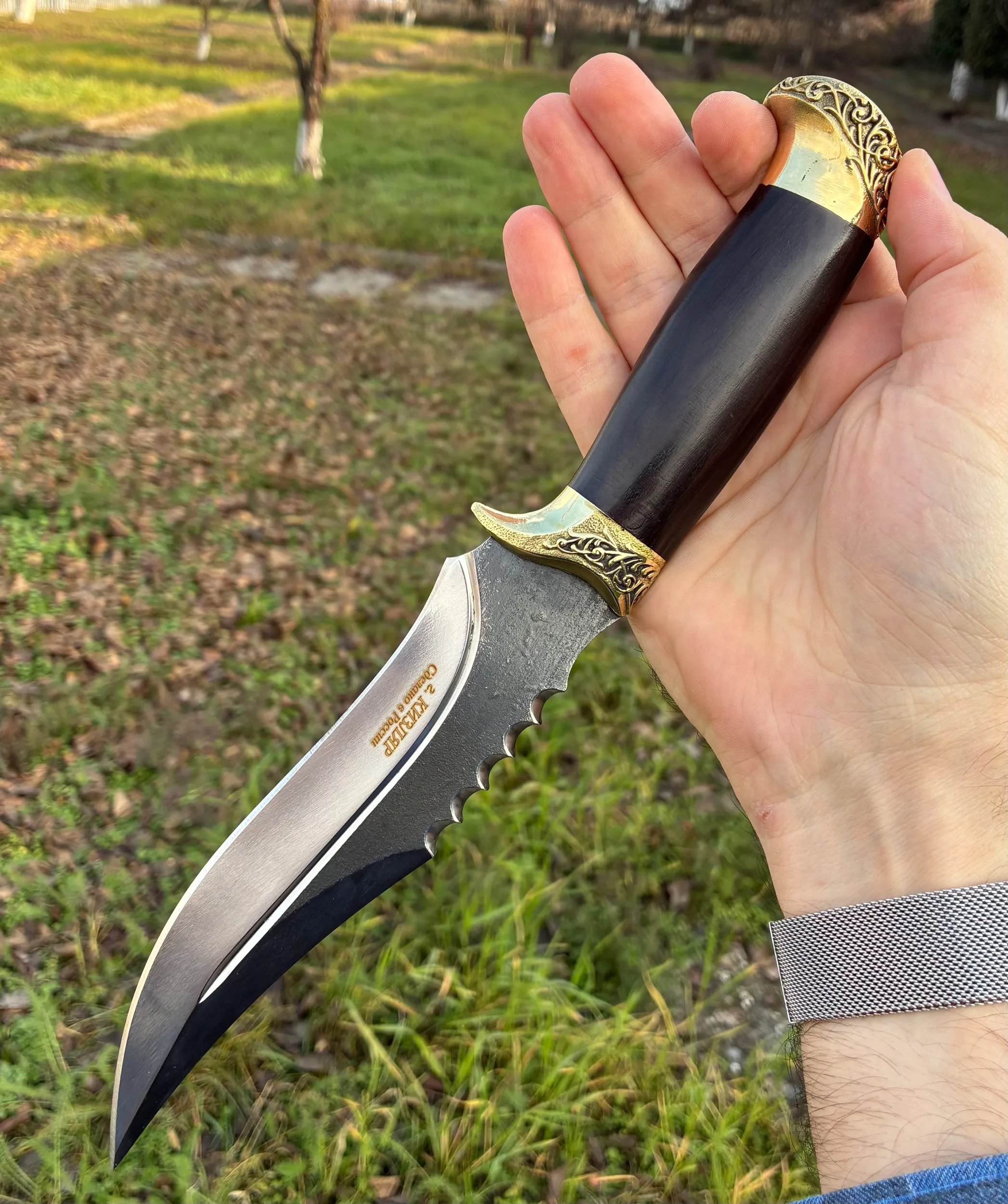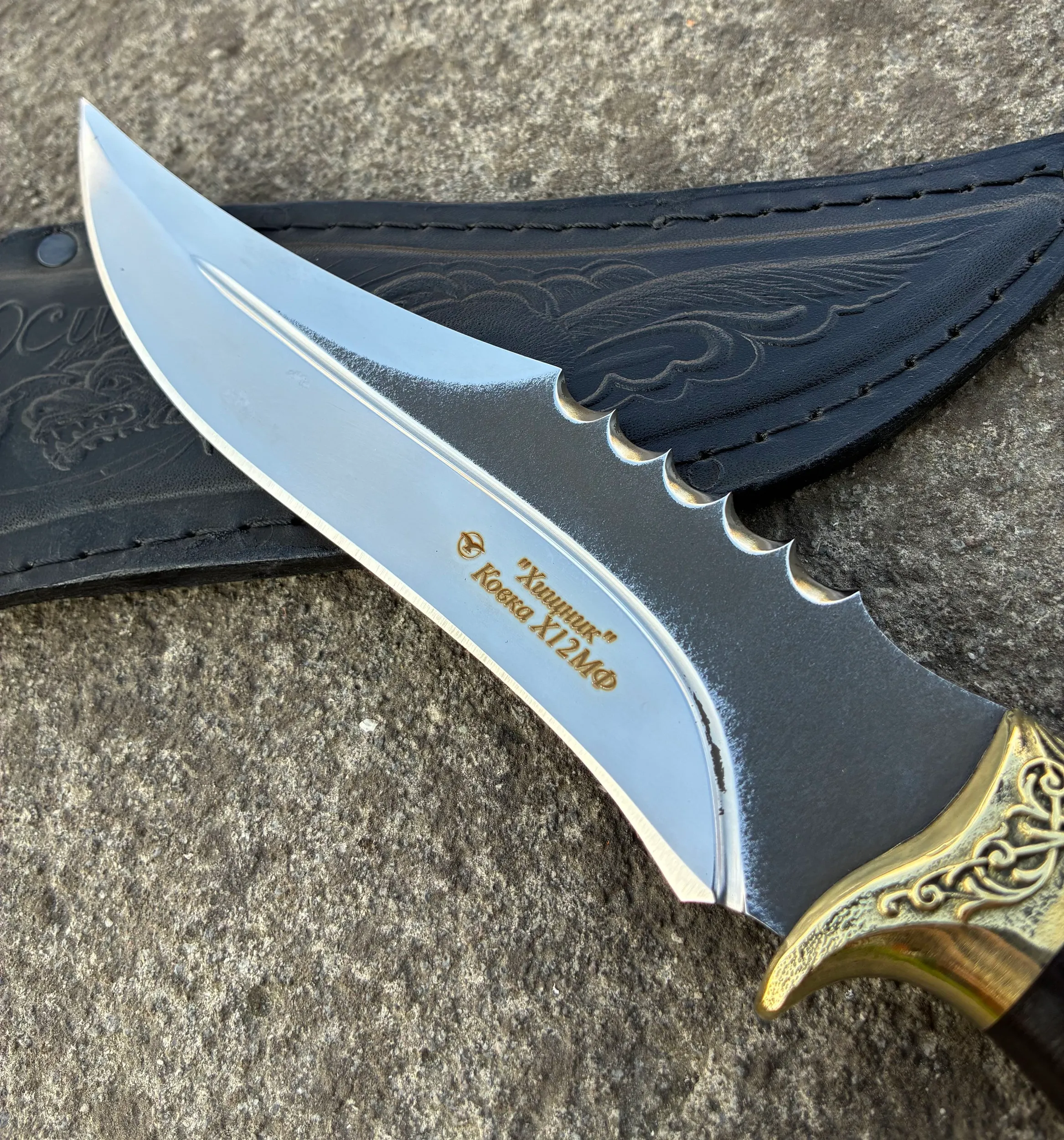 Кованый клинок из стали Х12МФ обеспечивает высокую прочность и долговечность. Твердость 58–60 HRC гарантирует сохранение остроты даже после длительного использования.