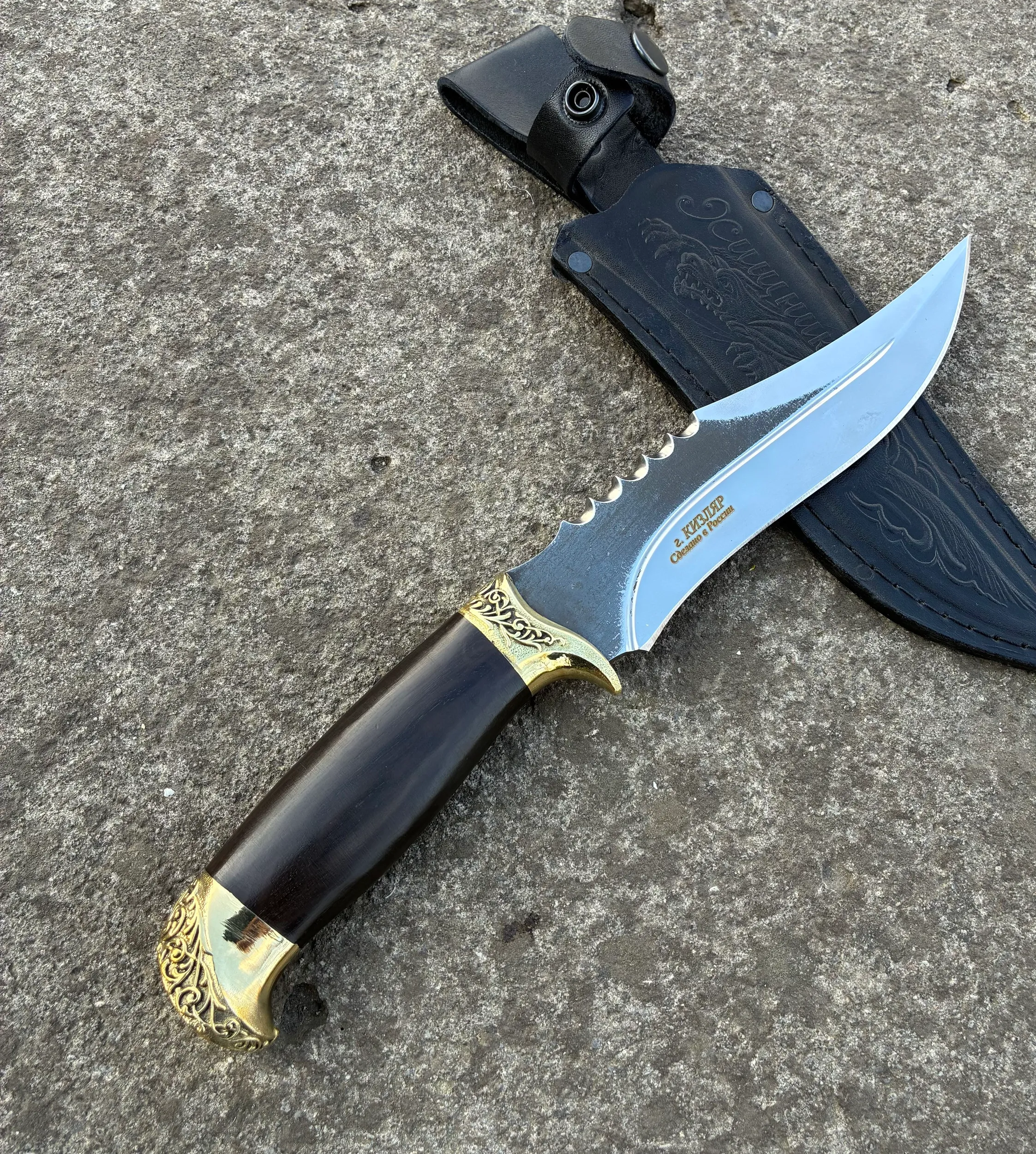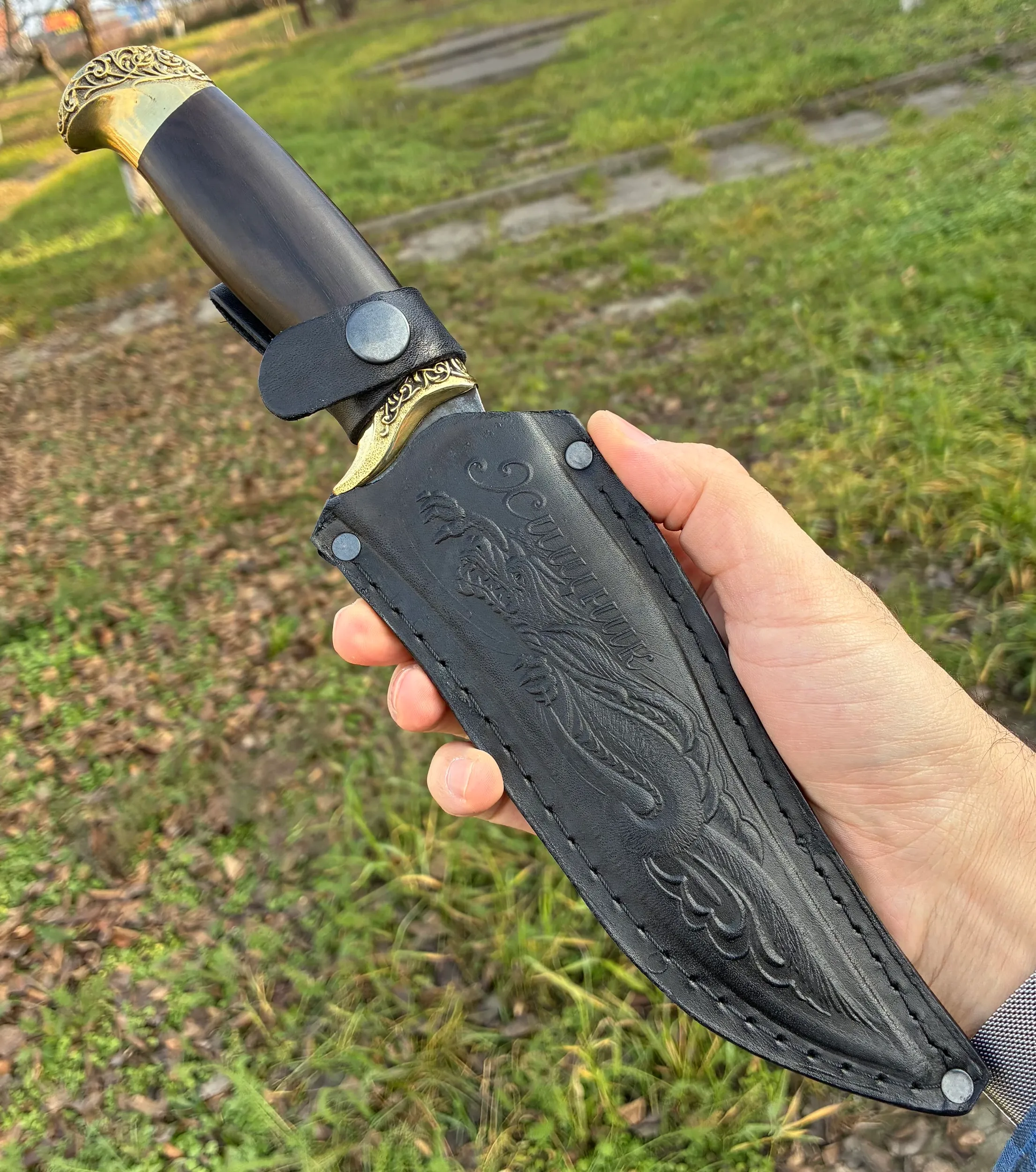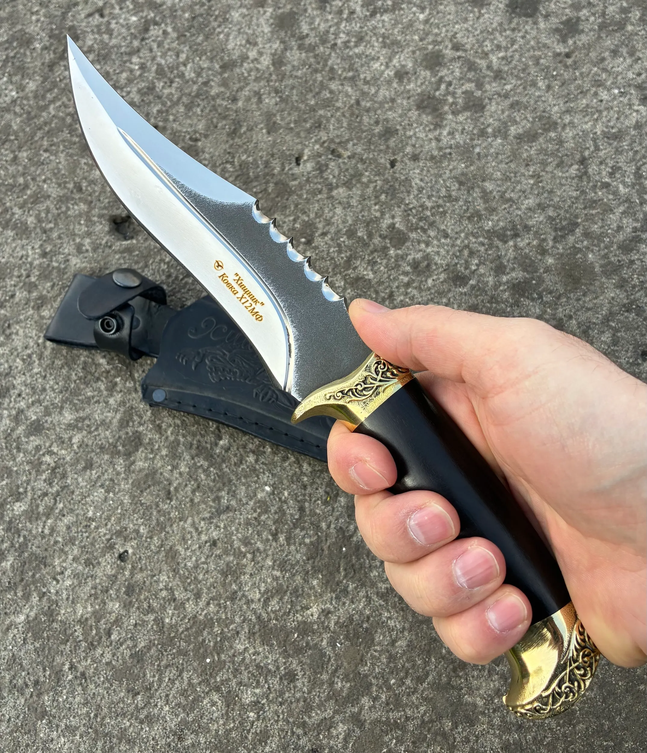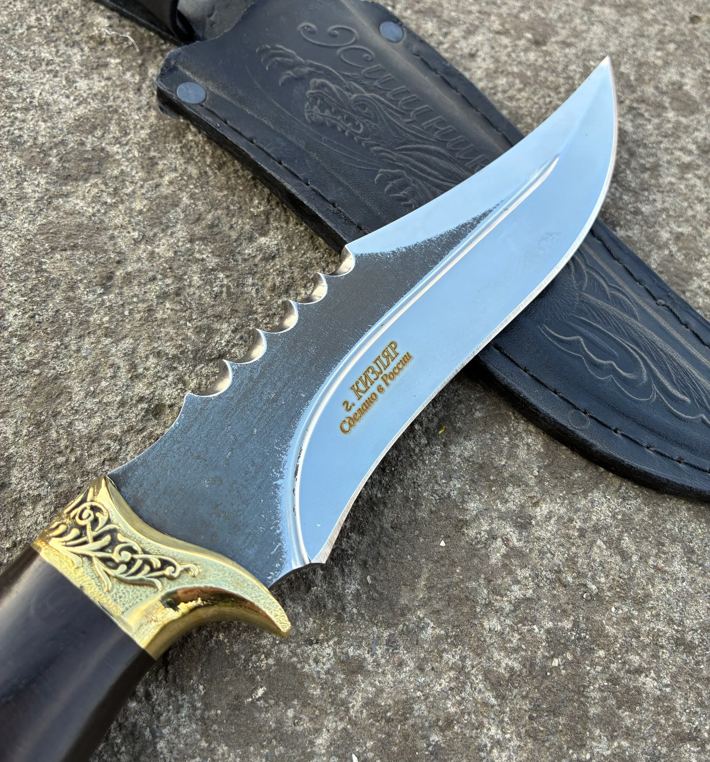 Кованый клинок из стали Х12МФ обеспечивает высокую прочность и долговечность. Твердость 58–60 HRC гарантирует сохранение остроты даже после длительного использования.