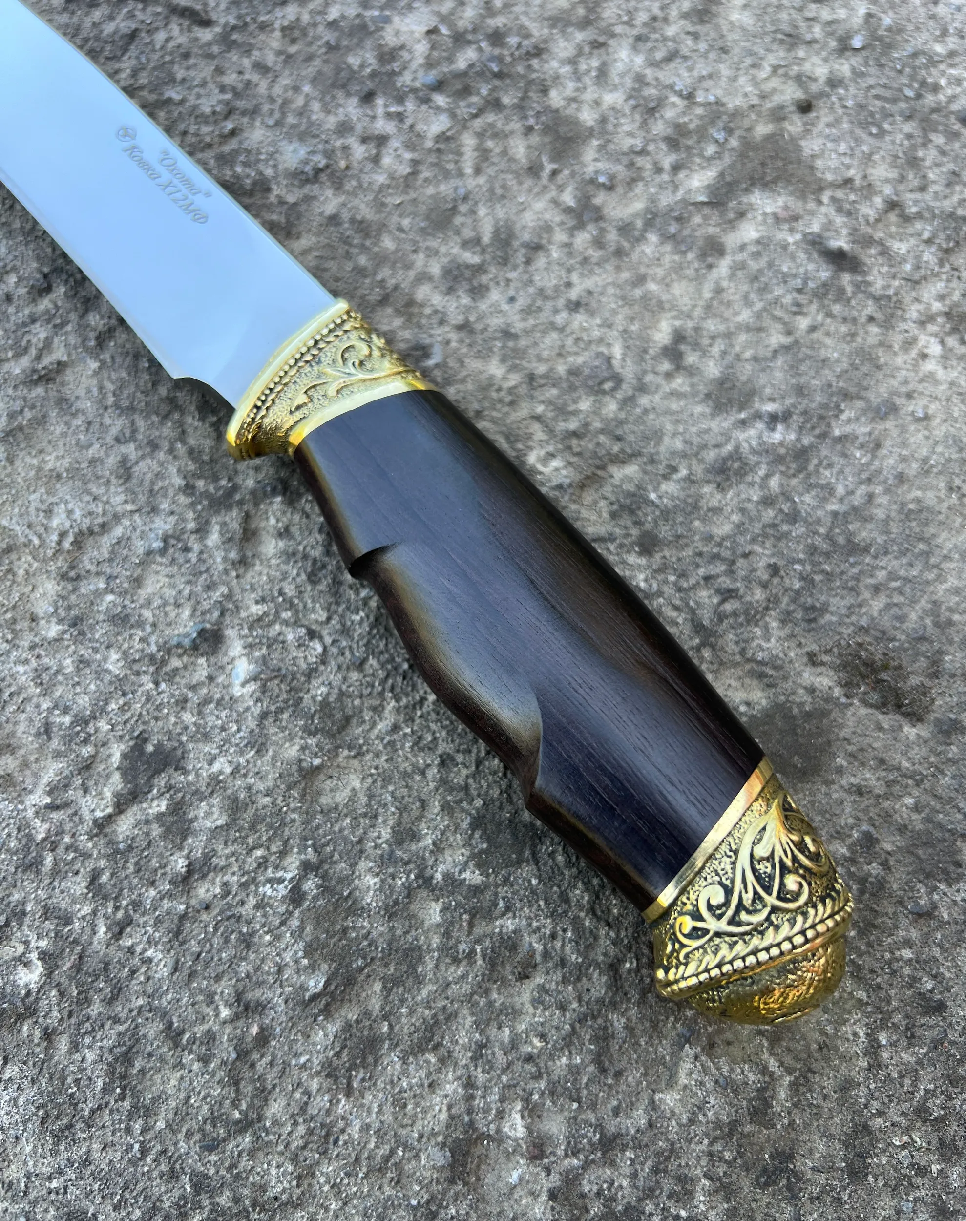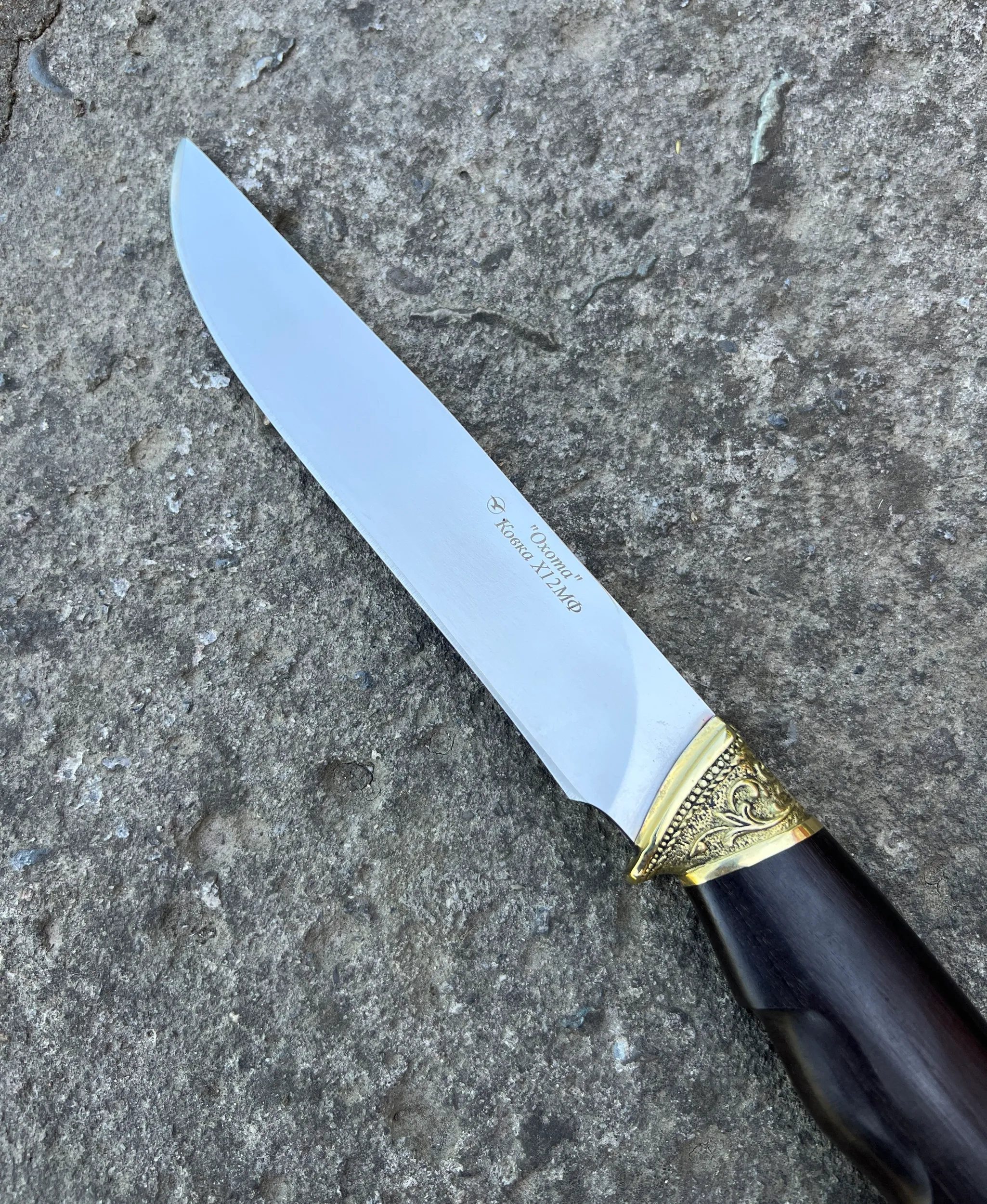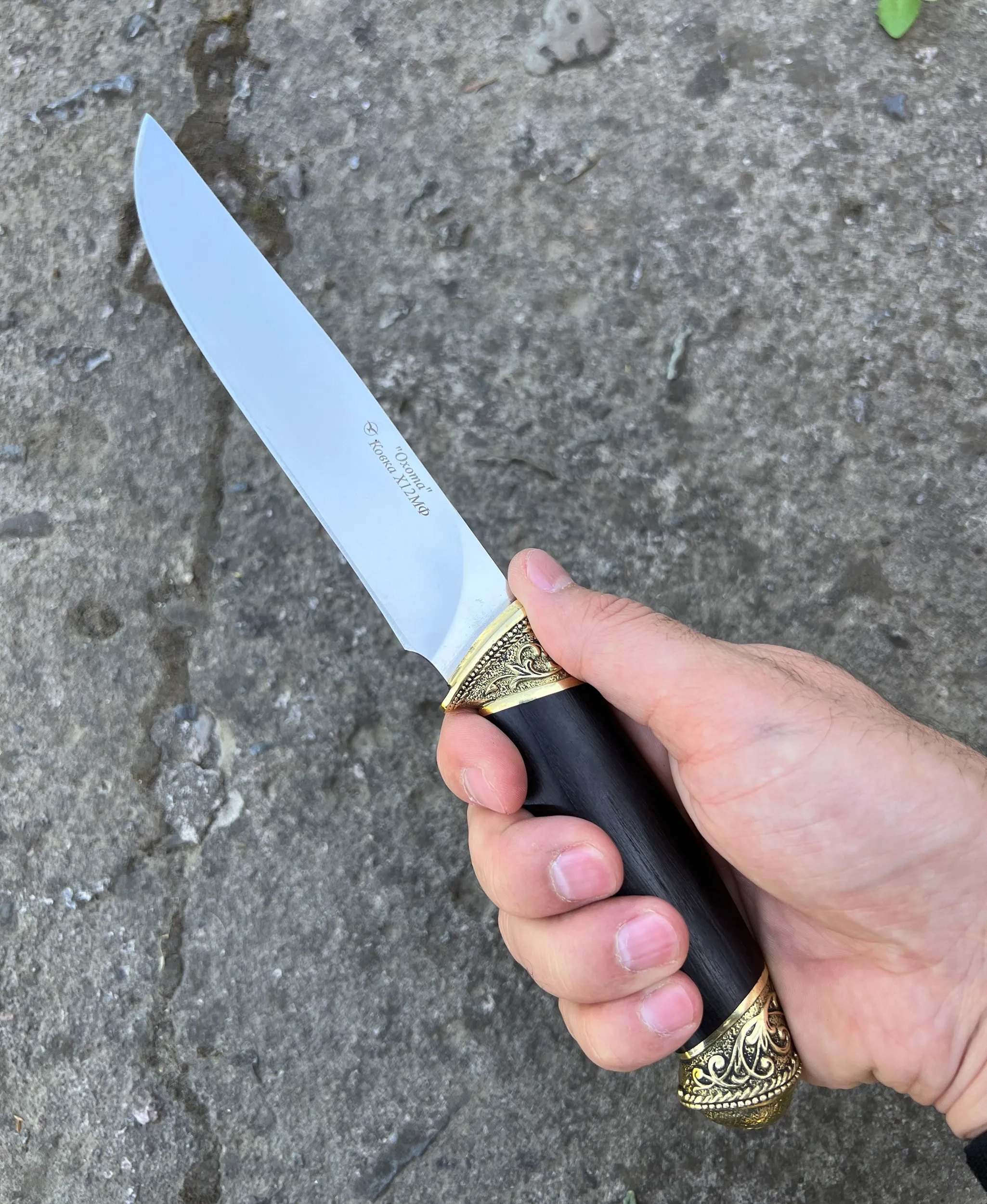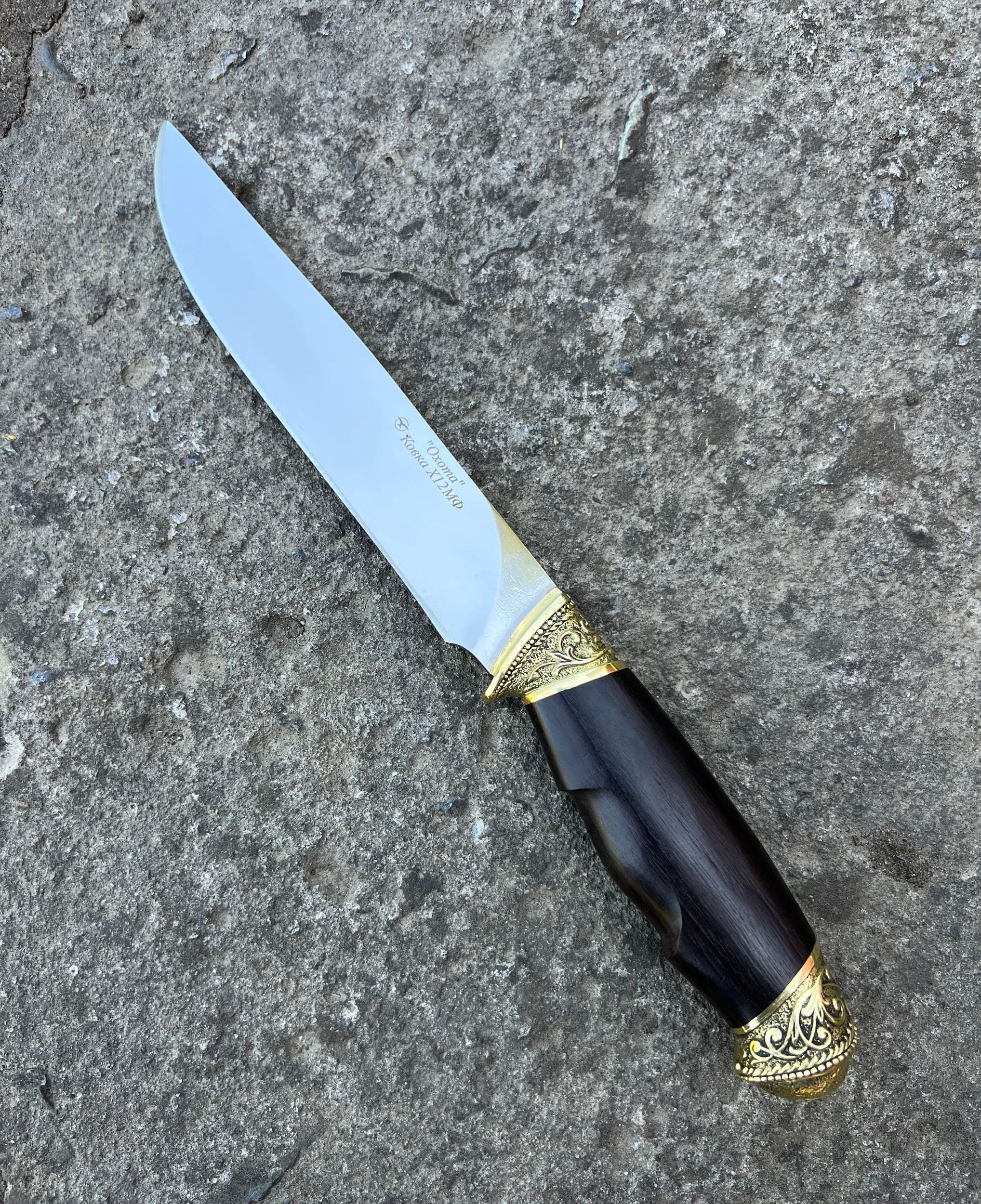 Кизлярский туристический нож Охота из Ковки Х12МФ рукоять натуральное черное дерево граб с орнаментальным латунным литьем. Отличный подарок для мужчины. В комплекте идут ножны из натуральной кожи. Отлично подойдет как для охоты, рыбалки и туризма, так и в качестве ножа на подарок мужу, отцу, брату, мужчине.