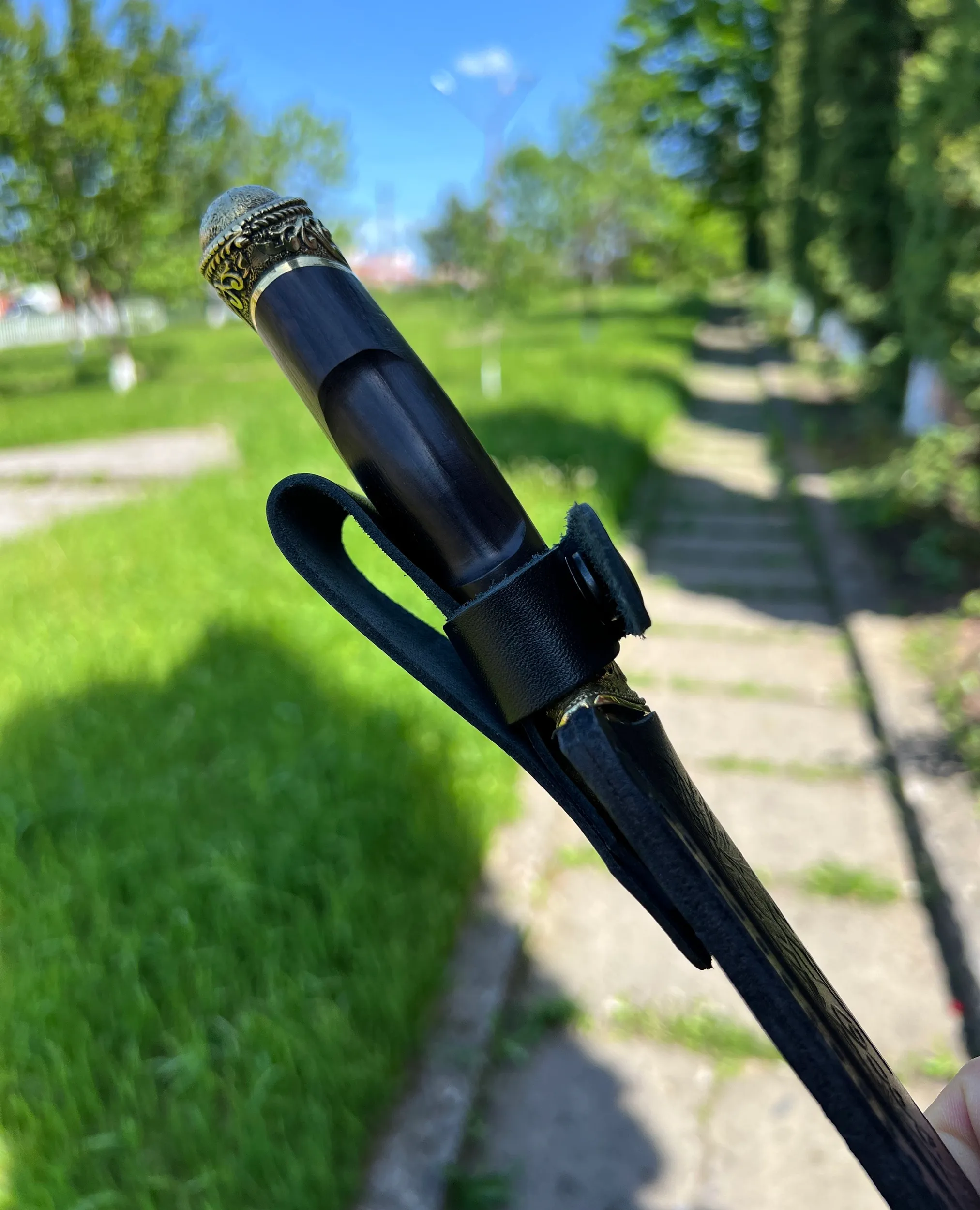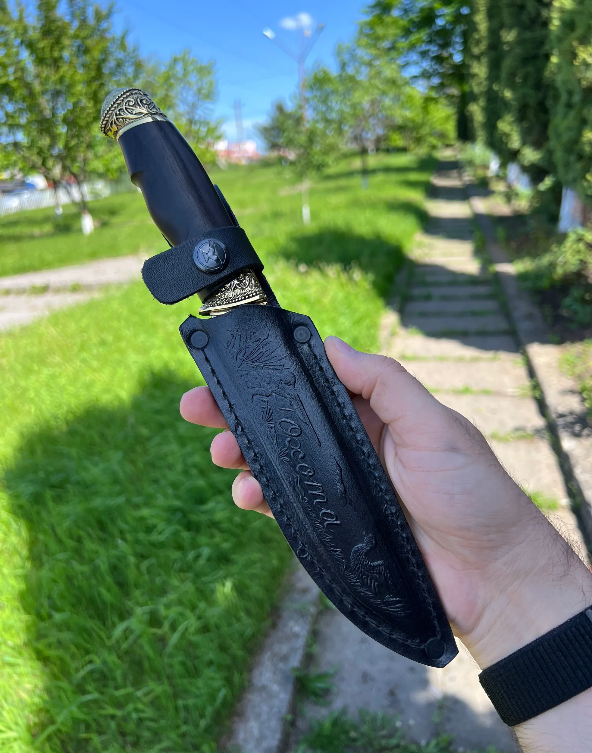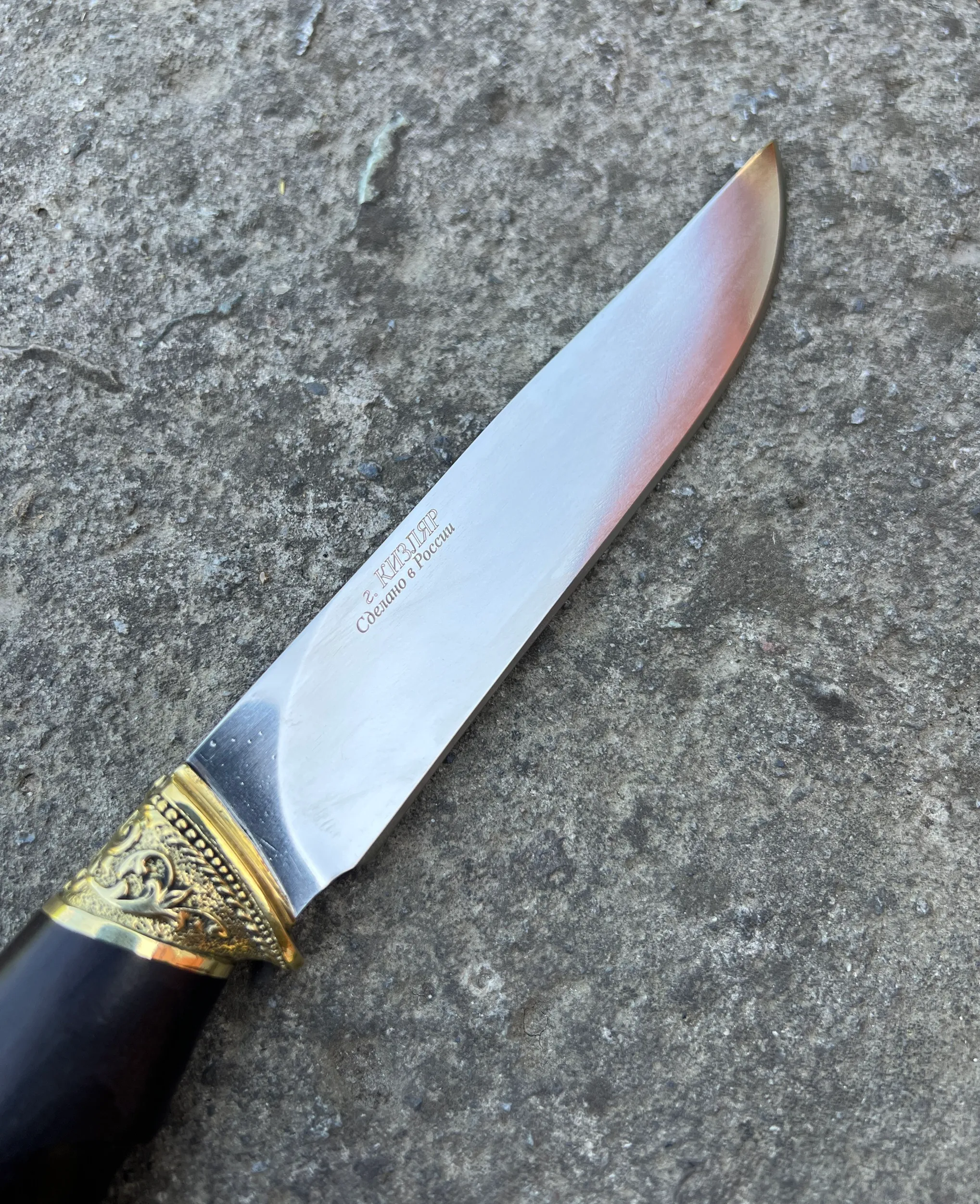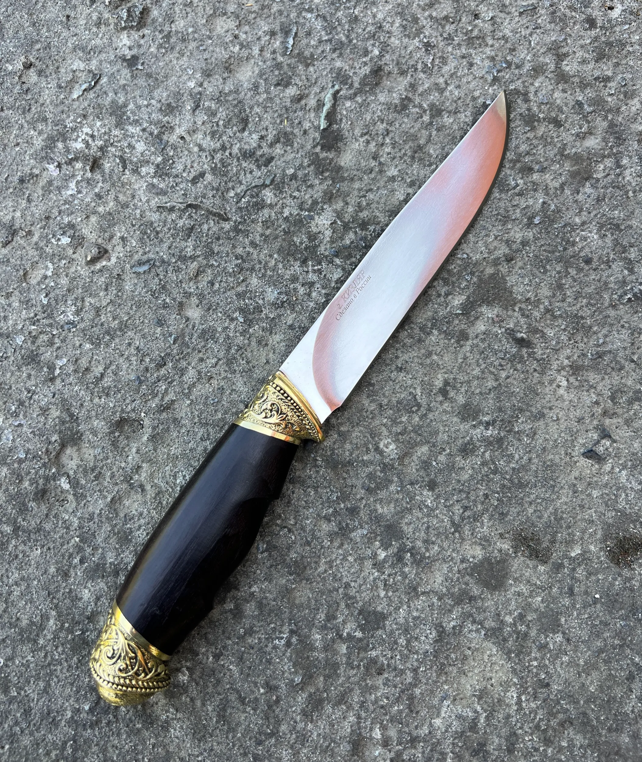 Кизлярский туристический нож Охота из Ковки Х12МФ рукоять натуральное черное дерево граб с орнаментальным латунным литьем. Отличный подарок для мужчины. В комплекте идут ножны из натуральной кожи. Отлично подойдет как для охоты, рыбалки и туризма, так и в качестве ножа на подарок мужу, отцу, брату, мужчине.