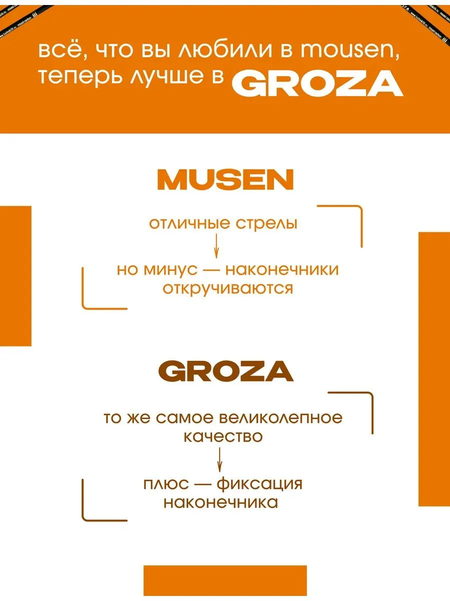 Набор стрел GROZA (6шт) — самые качественные стрелы для лука на маркетплейсе! Изготовлены из микс карбона для невероятной прочности и точности. Забудьте о поломках и промахах! GROZA гарантирует высокую скорость, дальность и стабильность полета. Превосходное качество по доступной цене! Закажите свой набор прямо сейчас и ощутите разницу!